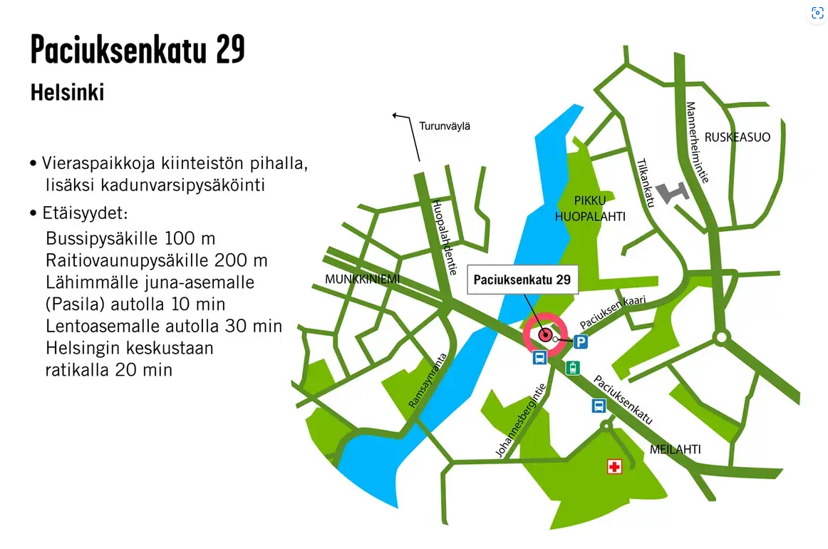 Meilahti on paitsi viihtyisän vehreä myös loistavasti saavutettavissa monesta eri suunnasta. Kiinteistö sijaitsee näkyvällä paikalla Töölön ja Munkkiniemen yhdistävän Paciuksenkadun varrella. Tänne pääsee niin Pohjois- ja Etelä-Helsingistä, Pasilasta, Leppävaarasta kuin myös merellisiä maisemia pitkin Otaniemestä. Helsingin keskustaan on vain vajaan 4 km matka. Paciuksenkatua liikennöivät useat bussilinjat, runkolinjat 30, 500 ja 510 sekä raitiovaunulinja 4. Pysäkeillä kulkuneuvon saapumista ei tarvitse kauan odotella.