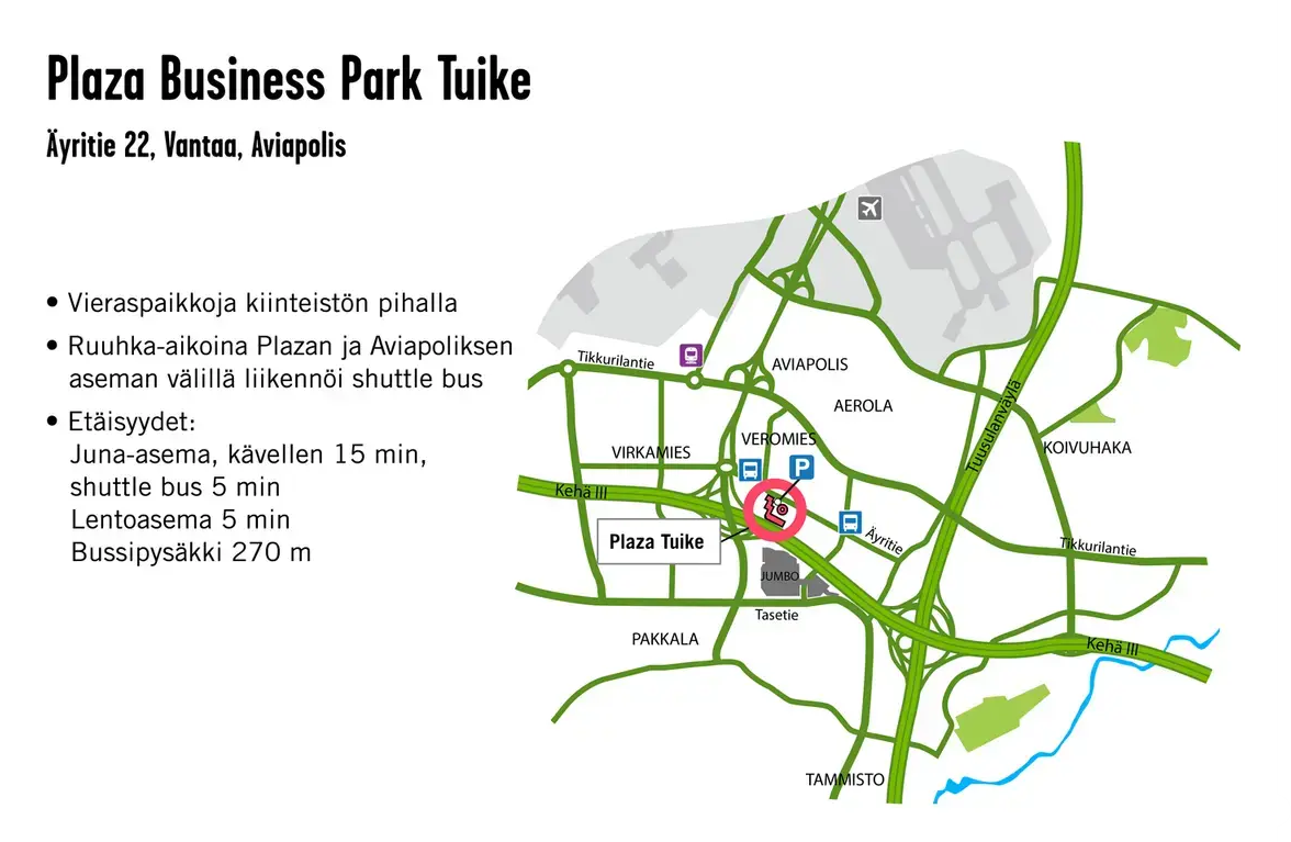 Plaza Business Park Tuike sijaitsee Vantaan Aviapoliksessa, aivan Kauppakeskus Jumboa vastapäätä. Kulkeminen eri puolilta pääkaupunkiseutua on sujuvaa, sillä yrityspuisto sijaitsee isojen väylien, Kehä III ja Tuusulanväylän kulmauksessa. Tikkurilaan on autolla matkaa 10 minuuttia, Leppävaaraan 20 minuuttia ja lentokentälle vain 5 minuuttia. Työmatkan suunta on tavallisesti aina pääkaupunkiseudun ruuhkia vastaan.